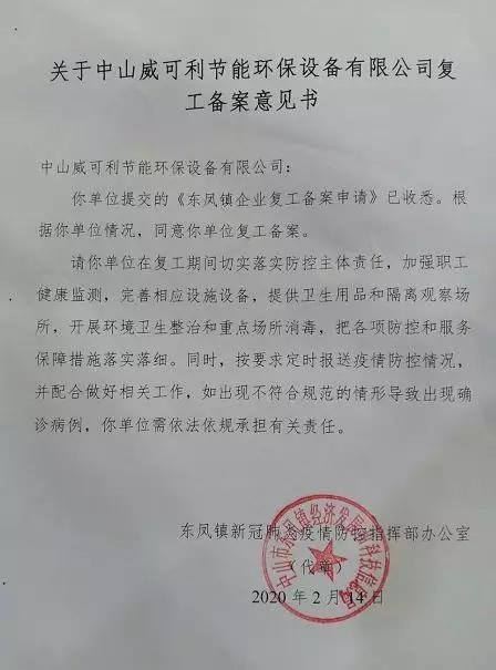 亚美体育是国家高新技术企业、广东省高薪企业、中山市规上企业,自新冠肺炎疫情发生以来,中山市威可利节能环保设备有限公司高度重视,为全体员工购买了50万元的病疫医疗险,并严格落实防控工作,排摸人员信息,筹集防护物资,制定应急预案,细化防控方案。近日获得政府审核批准复工。